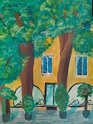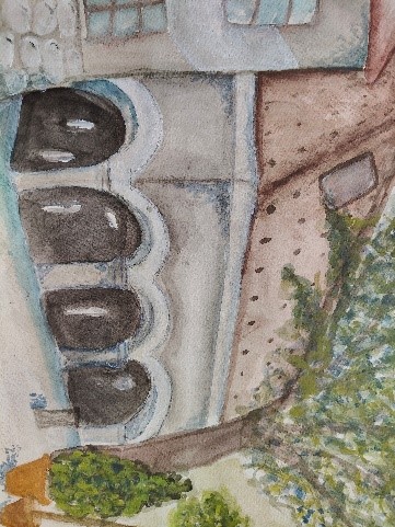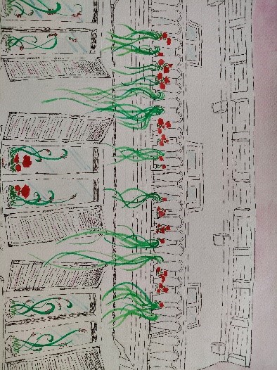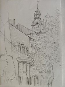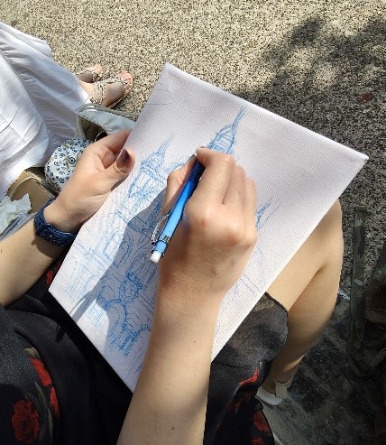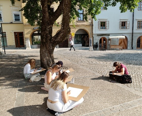 V četrtek, 12. junija, smo se z navdušenimi in nadarjenimi dijakinjami dobile ob 8. uri pred Hišo kulinarike, na Glavnem trgu, v Novem mestu. Tema extempora je vsako leto enaka, to pomeni, da rišemo motive in vedute Novega mesta. Izbrati motiv ni tako enostavno, saj mesto ponuja veliko izbiro. Posedle smo se po tleh, po stopnicah, stolih lokalov, razvrstile likovne pripomočke okoli sebe in se osredotočile na delo. Z dobro malico so nas prijazno postregli dijaki gostinske šole v gostišču. Nato smo nadaljevale delo do 13.30. Imele smo se lepo in bi si želele še več takih dni.