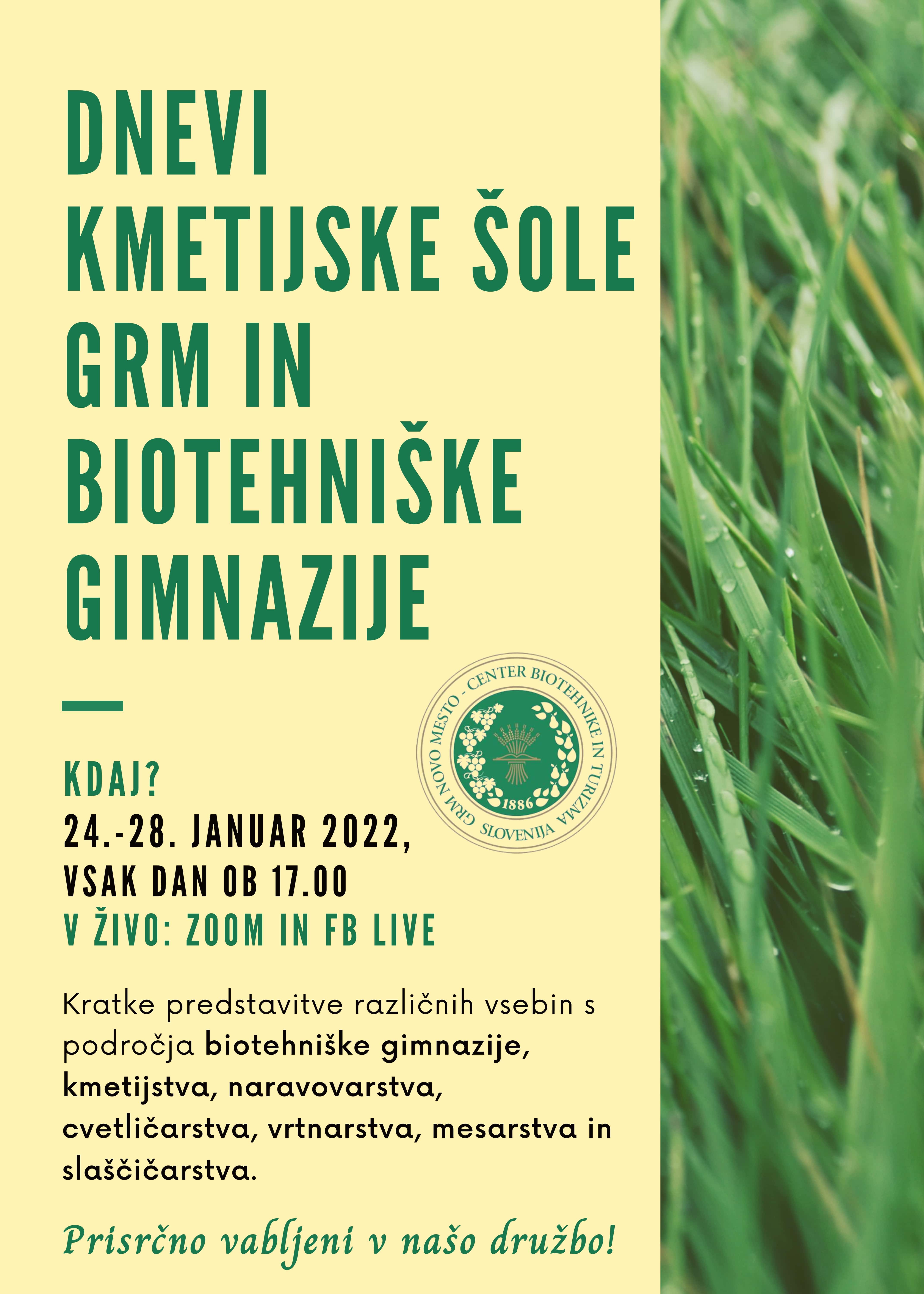 Prisrčno vabljeni, da se nam pridružite na letošnjih DNEVIH KMETIJSKE ŠOLE GRM IN BIOTEHNIŠKE GIMNAZIJE. Dobimo se vsak dan od 24. do 28. 1. 2022 ob 17h!
