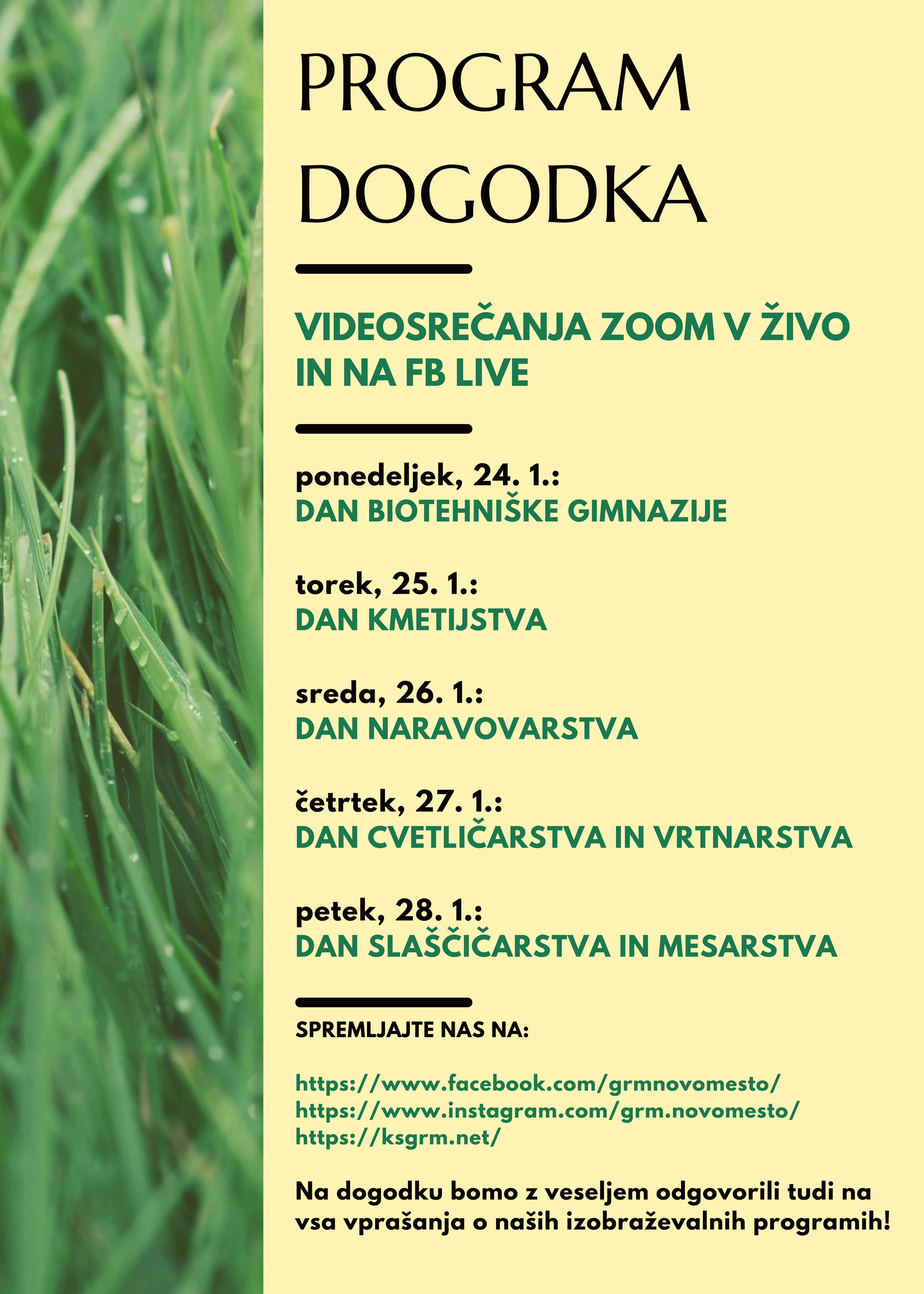 Na srečanjih ZOOM se boste lahko v živo ali na FB LIVE seznanili, kdo smo, kje se nahajamo in za katere programe izobražujemo. Spoznali boste tudi naše zaposlene, ki vam bodo vsak dan od 24. do 28. 1. predstavili 2 kratki, zanimivi vsebini, s katerimi se srečujejo grmski dijaki tekom šolanja pri nas.