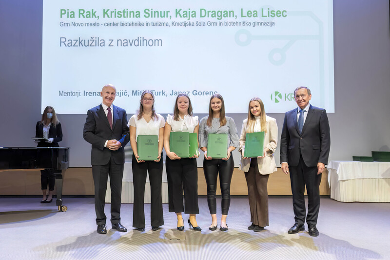 Na razpis za 52. Krkine nagrade je prispelo kar 42 raziskovalnih nalog iz celotne Slovenije. Zato smo toliko bolj ponosni, da so PIA RAK, KAJA DRAGAN, KRISTINA SINUR in LEA LISEC iz 4. b razreda grmske biotehniške gimnazije osvojile tako zaželeno KRKINO NAGRADO. Svoje delo z naslovom RAZKUŽILA Z NAVDIHOM so prepričljivo predstavile in zagovarjale pred številčnim občinstvom.