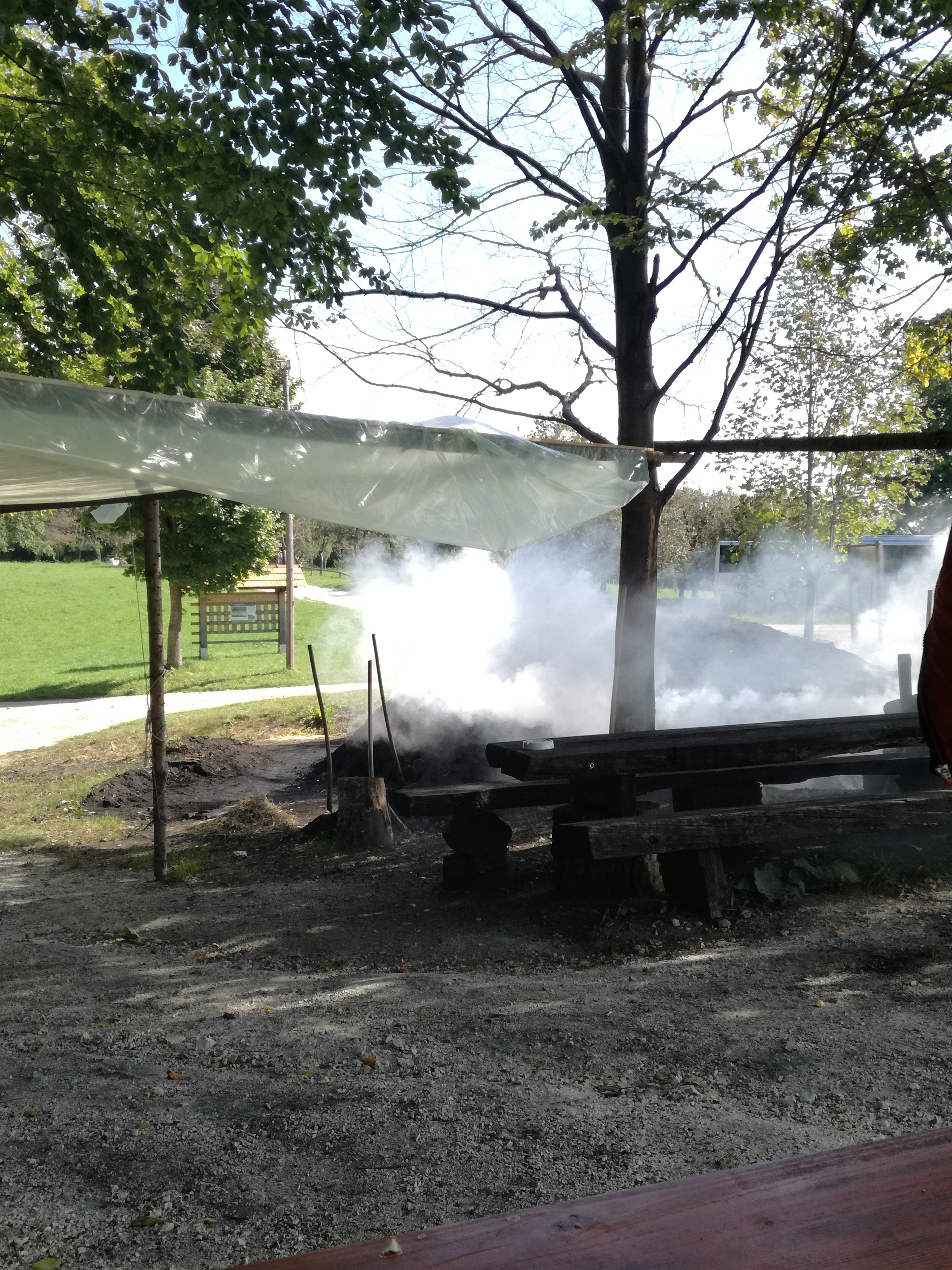 Polni novih moči smo se sprehodili do oglarske kope, ki gori pri Domu na Miklavžu. Tamkajšnja vodička nam je povedala veliko informacij o oglarstvu: o pripravi, pokrivanju, zažiganju, bokanju, kuhanju oz. oglenenju kope ter o preteklosti oglarstva. Izvedeli smo, da je barva uhajajočega dima prepoznavno znamenje, kdaj je oglje kuhano.