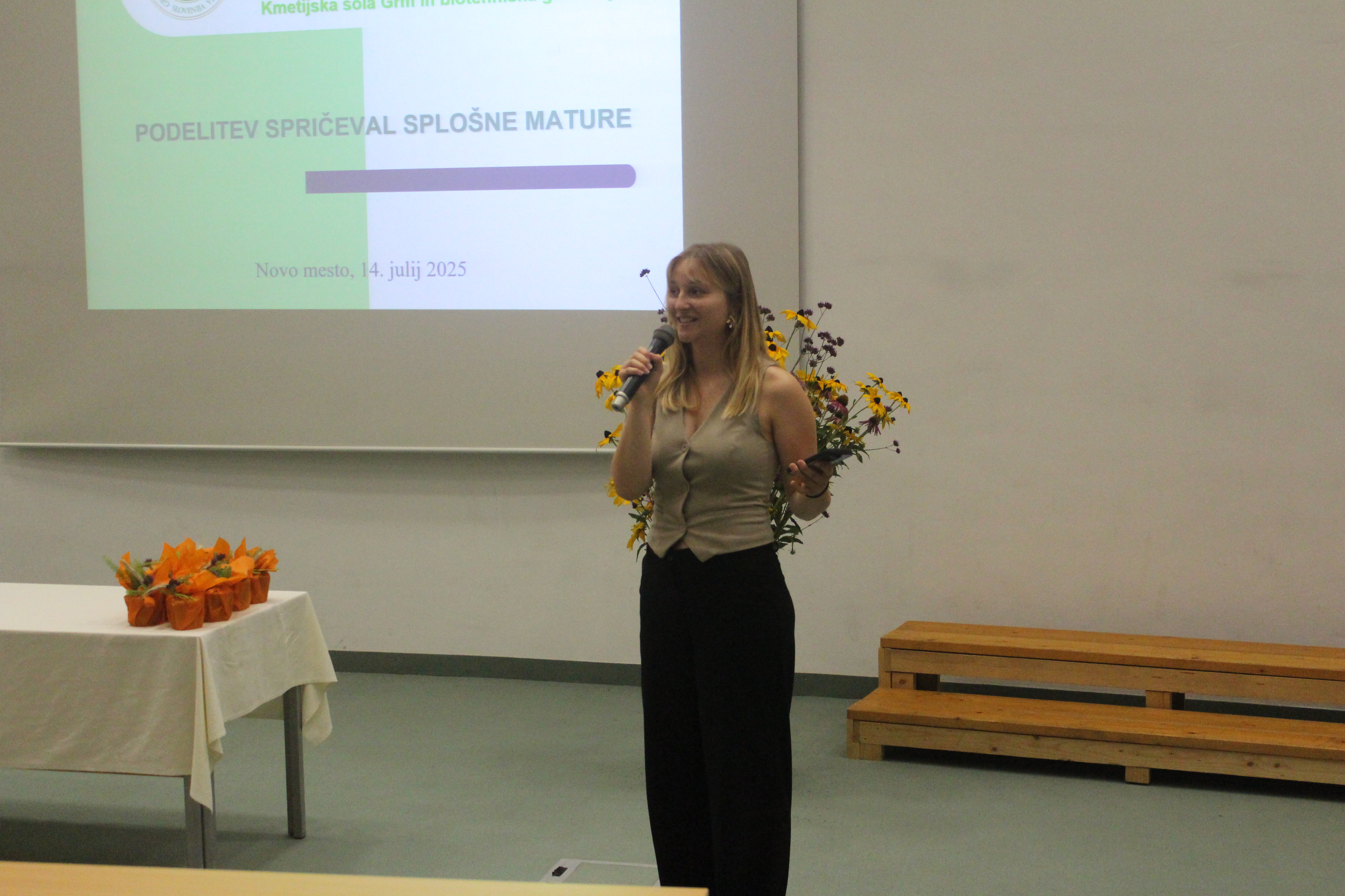 Danes, 14. 7. 2025, je na Kmetijski šoli Grm in biotehniški gimnaziji potekala slovesna podelitev spričeval maturantom biotehniške gimnazije. Splošno maturo je v spomladanskem roku opravljalo 36 letošnjih dijakov 4. a in 4. b oddelka, ki so dosegli 92 % uspeh. 4 dijaki so, ob poklicni maturi, tudi uspešno opravili 5. predmet.