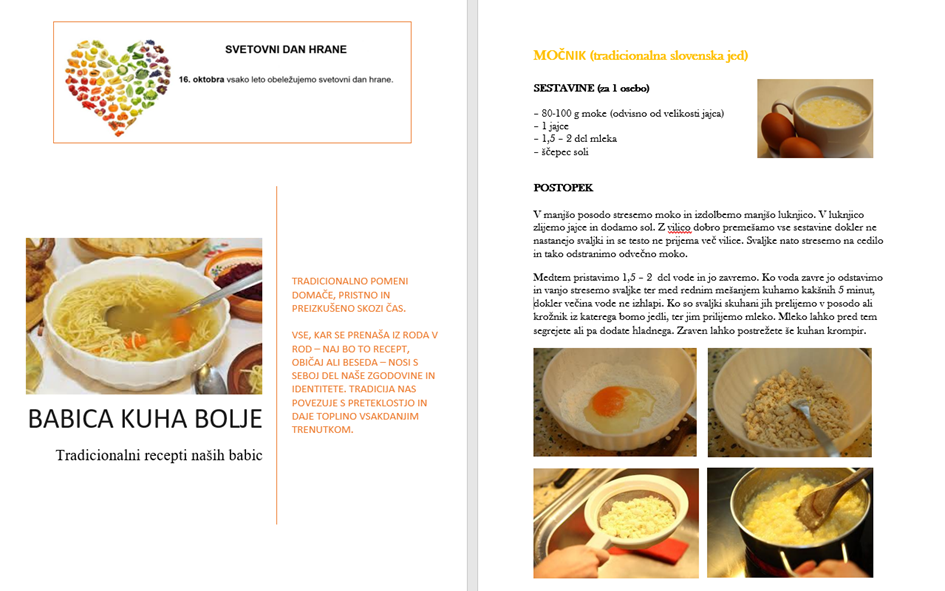 Na stojnici smo predstavili stare družinske recepte dijakov, ki so bili zbrani v kuharski knjižici Babica kuha bolje. Obiskovalci so si lahko ogledali recepte za domačo govejo juho, krompirjeve žgance, pogače, potico, močnik, srbske polnjene paprike in druge jedi, ki so nekoč redno dišale iz kuhinj starih staršev. Ob tem so bili povabljeni, da doma preizkusijo katerega od predstavljenih receptov.