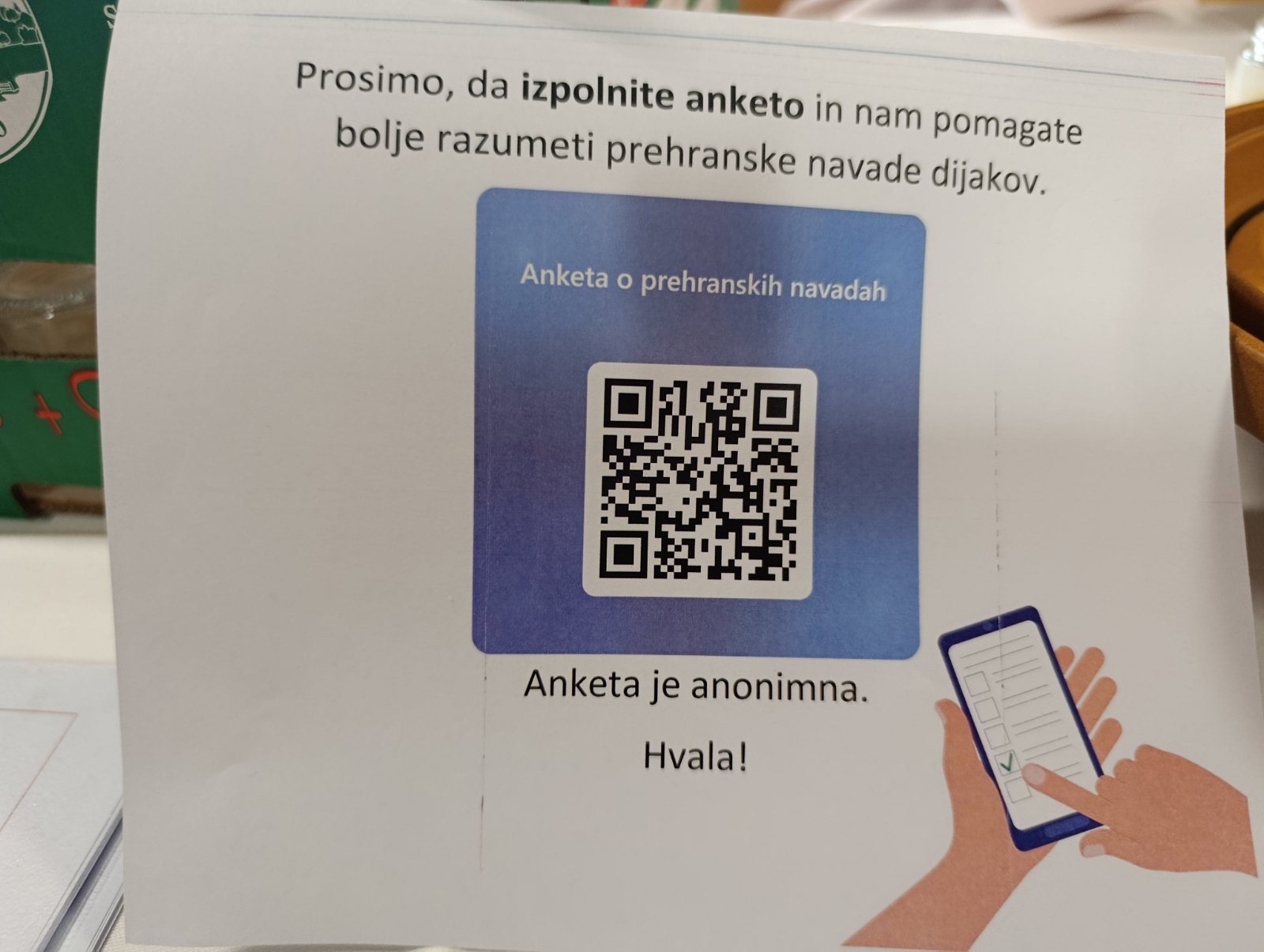 Dijaki 3. letnika programa naravovarstveni tehnik so pod mentorstvom profesorice Nine Jarc izdelali anketo o prehranskih navadah naših dijakov. Poskenirajte QR-kodo in sodelujte tudi vi!